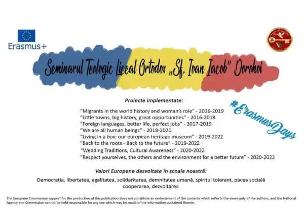 Proiectele Erasmus+, finanțate de Uniunea Europeană prin Agenţia Naţională pentru Programe Comunitare în Domeniul Educaţiei şi Formării Profesionale (ANPCDEFP), au devenit deja tradiție pentru Seminarul Teologic Liceal Ortodox „Sfântul Ioan Iacob” Dorohoi.