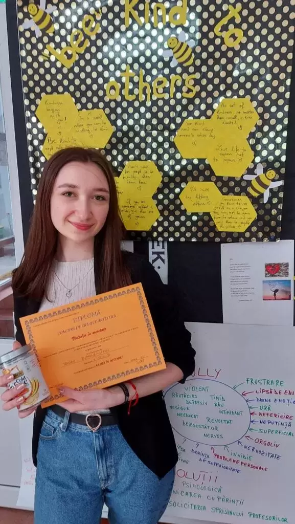-VIOLENŢA ÎN SOCIETATE - elevii au fost invitaţi să participe la un concurs de creaţie artistică pe tema nonviolenţei. Concursul a fost anunţat cu o săptămâna înainte iar cea mai frumoasă lucrare afost premiată vineri, 28.01.2022. Câştigătoarea concursului a fost eleva Prodan Ramona-Maria care a venit cu o idee originală şi cu un mesaj pe măsură: ’’BEE kind to others!’’