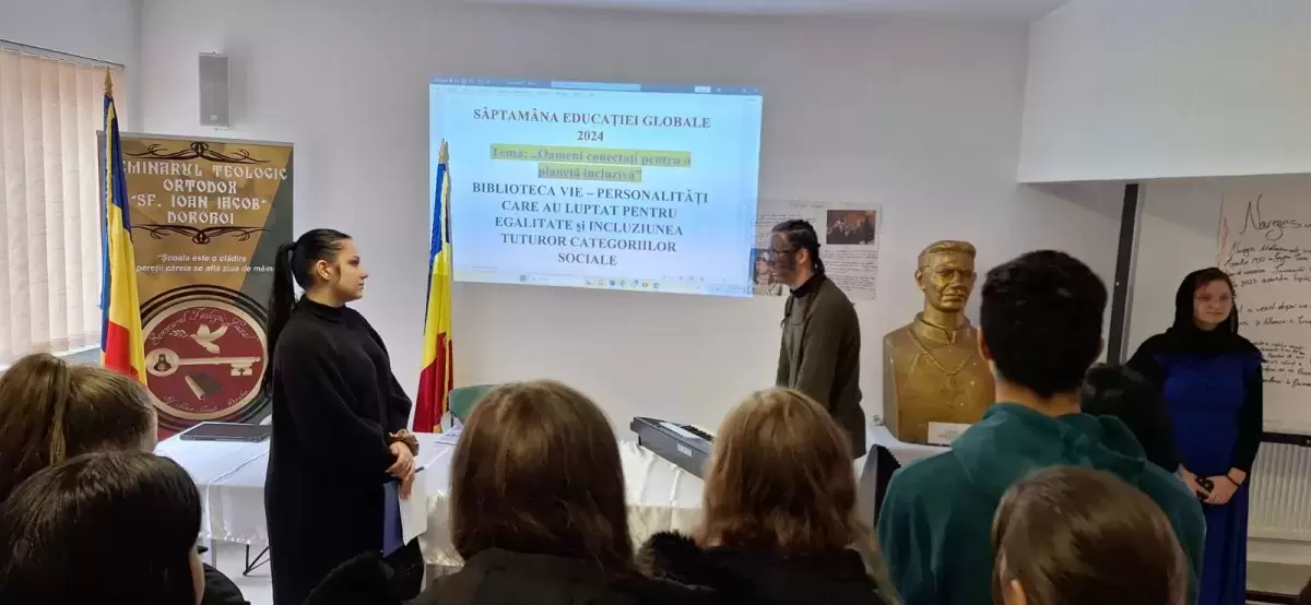 Joi, 21.11.2024, în Sǎptǎmâna Educației Globale, elevii Seminarului Teologic Liceal Ortodox „Sf. Ioan Iacob’’, Dorohoi, au desfǎșurat activitatea intitulatǎ BIBLIOTECA VIE – PERSONALITǍȚI CARE AU LUPTAT PENTRU EGALITATE și INCLUZIUNEA TUTUROR CATEGORIILOR SOCIALE.