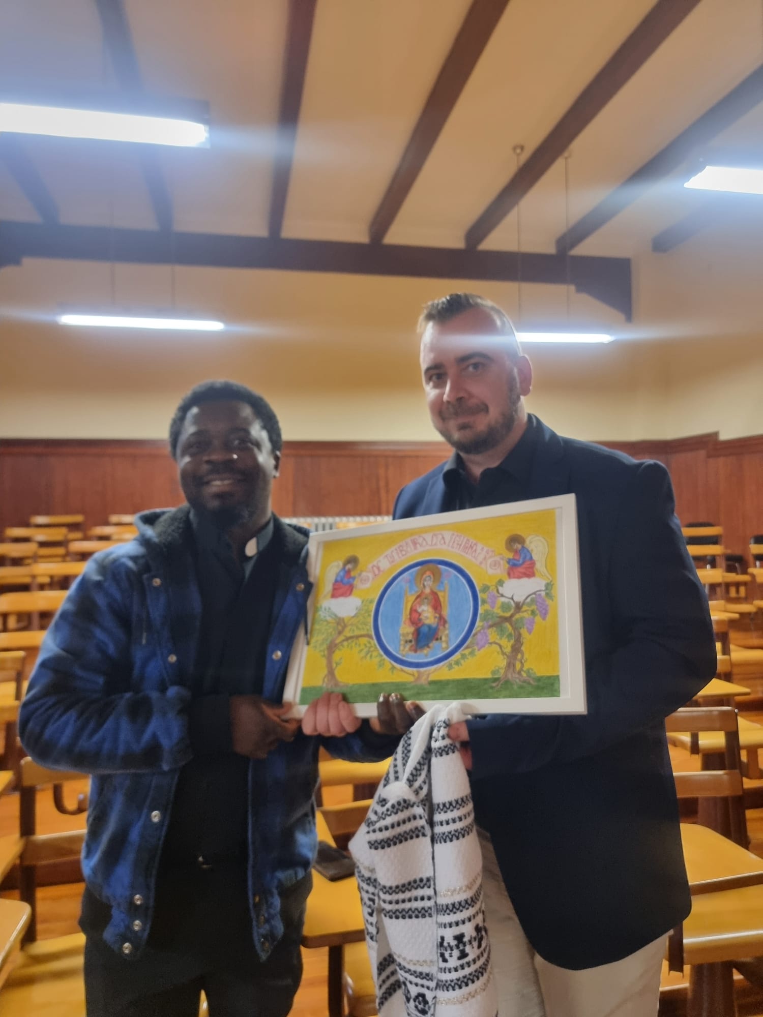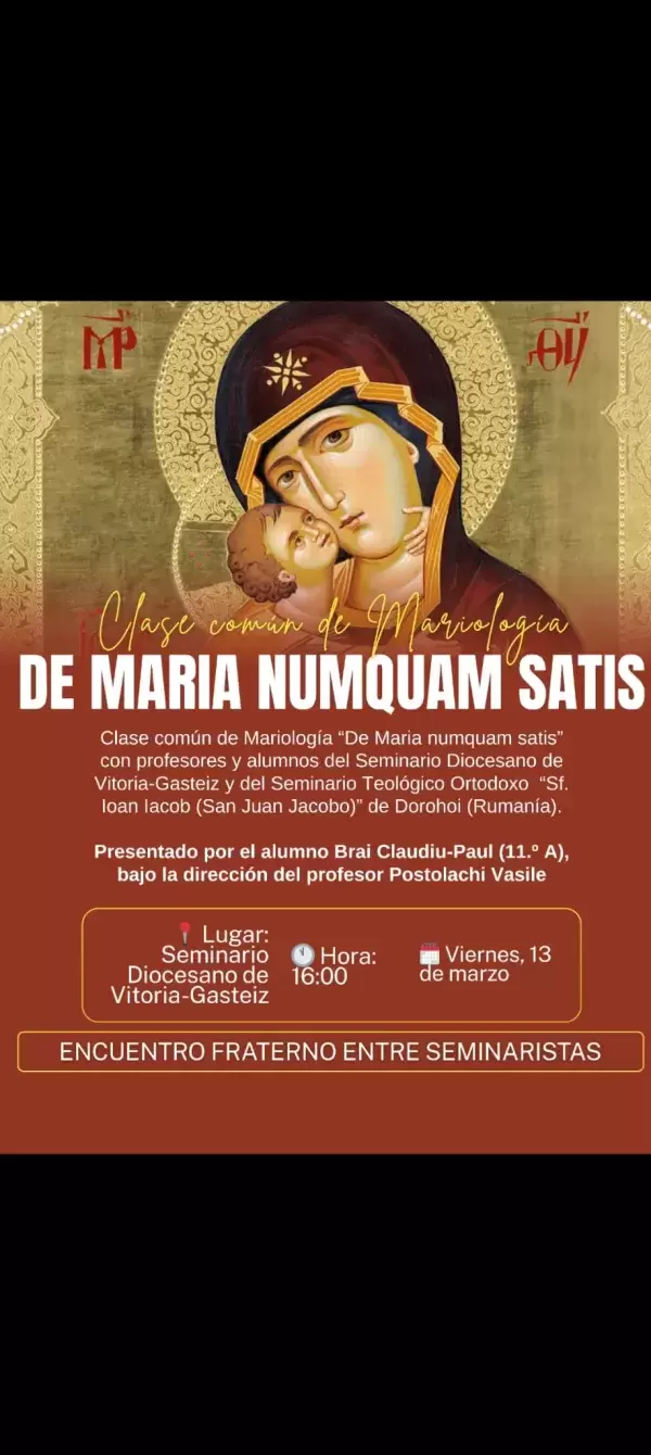 Tot în incinta Seminarului diocesan s-a derulat vineri, 13 martie și o oră comună de mariologie (De Maria numquam satis), în cadrul căreia elevul Brai Claudiu (clasa a XI a) a prezentat referatul ,,Virgen Maria en la devocion ortodoxa del pueblo rumano” (Fecioara Maria în evlavia ortodoxă a poporului român) și un seminarist spaniol a susținut referatul ” Fecioara Maria ca semn al speranței” iar la finalul orei, corurile celor două seminarii au cântat câte un imn Maicii Domnului iar domnul profesor Postolachi Vasile a dăruit Seminarului diocesan o icoana a Maicii Domnului, pictată de elevul Rus Robert (clasa a XII a A), participant în ediția anterioară a proiectului. După încheierea orei, în semn de prețuire și prietenie seminariștii dorohoieni au dăruit celor din Vitoria Gasteiz tricouri de fotbal personalizate.