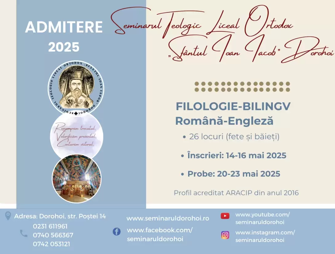 - 4 august 2025 - Înscrierea pentru probele de verificare a cunoștințelor de limbă modernă (la secretariatul Seminarului Teologic Dorohoi).