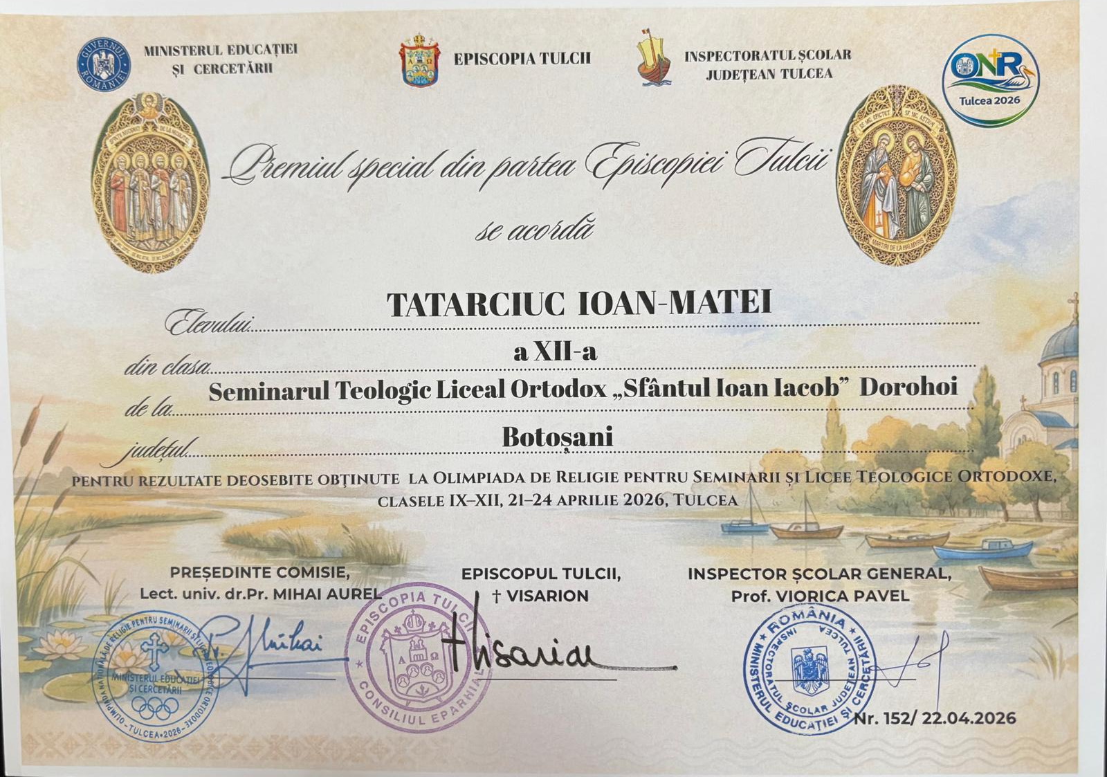 Finalul Olimpiadei Naționale de Religie a adus și motive de bucurie pentru Seminarul Teologic din Dorohoi, prin obținerea unui Premiu special de către elevul Ioan Matei Tatarciuc, la disciplina Dogmatică, ca recunoaștere a pregătirii, seriozității și implicării sale deosebite. Acest rezultat reprezintă o onoare pentru Seminarul Teologic din Dorohoi și evidențiază munca depusă atât de elev, cât și de mentor, profesorul doctor Vasile Postolachi. Merită evidențiată și situarea la un nivel competițional bun a celorlați participanți: Iustin Nahoi (IBOR), Alexandru Mercaș (Noul Testament) și Ștefan Eusebiu Coșman (Vechiul Testament).