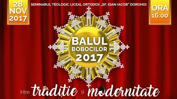 Elevii claselor a XII-a de la Seminarul Teologic Liceal Ortodox „Sf. Ioan Iacob” din Dorohoi vă invită la Balul Bobocilor 2017! Tema de anul acesta este „Între TRADIȚIE și MODERNITATE” Din programul spectacolului nu vor lipsi dansurile tradiționale și moderne, piesele de teatru, momentele surpriză și voia bună. Acestea se vor întâlni marți, 28 noiembrie 2017, pe scena Sălii Teatrului din Dorohoi, începând cu ora 16:00! Cele 10 perechi vor debuta pe scenă cu prezentarea, vor dansa vals, populară și un dans la alegere, după care își vor etala talentele în cadrul probei de aptitudini. Alături de aceste probe, organizatorii vă pregătesc și alte momente surpriză! Pe Scena Sălii Teatrului vor evolua și alți tineri ai liceului cu momente reprezentative pentru tema spectacolului. Mai multe detalii puteți găsi pe pagina oficială a Seminarului: www.facebook.com/seminaruldorohoi