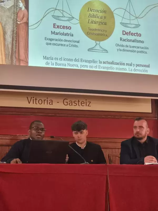 Tot în incinta Seminarului diocesan s-a derulat vineri, 13 martie și o oră comună de mariologie (De Maria numquam satis), în cadrul căreia elevul Brai Claudiu (clasa a XI a) a prezentat referatul ,,Virgen Maria en la devocion ortodoxa del pueblo rumano” (Fecioara Maria în evlavia ortodoxă a poporului român) și un seminarist spaniol a susținut referatul ” Fecioara Maria ca semn al speranței” iar la finalul orei, corurile celor două seminarii au cântat câte un imn Maicii Domnului iar domnul profesor Postolachi Vasile a dăruit Seminarului diocesan o icoana a Maicii Domnului, pictată de elevul Rus Robert (clasa a XII a A), participant în ediția anterioară a proiectului. După încheierea orei, în semn de prețuire și prietenie seminariștii dorohoieni au dăruit celor din Vitoria Gasteiz tricouri de fotbal personalizate.