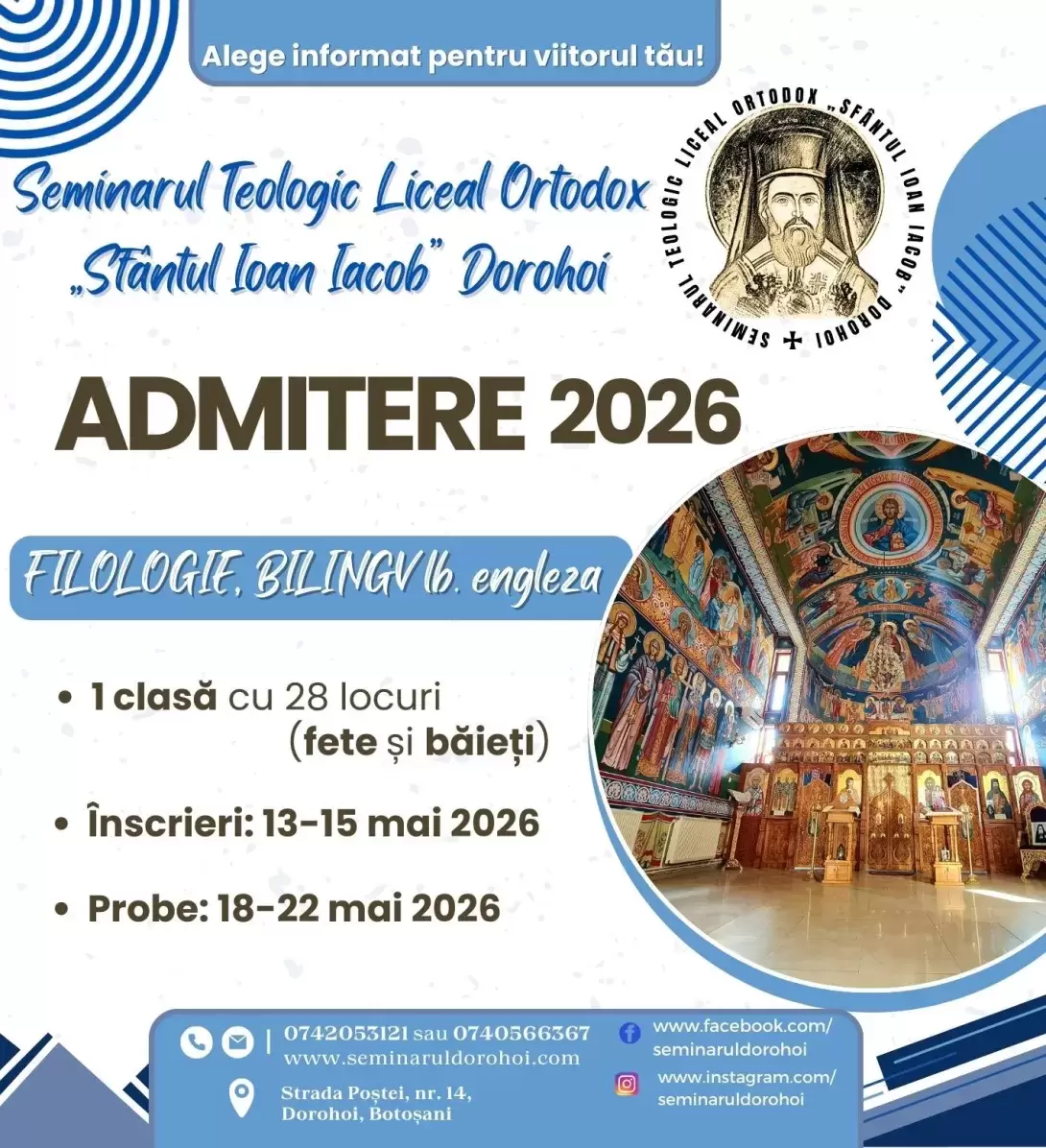 - 13-15 mai 2026 - Înscrierea pentru probele de verificare a cunoștințelor de limbă modernă (la secretariatul Seminarului Teologic Dorohoi).