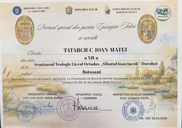 Finalul Olimpiadei Naționale de Religie a adus și motive de bucurie pentru Seminarul Teologic din Dorohoi, prin obținerea unui Premiu special de către elevul Ioan Matei Tatarciuc, la disciplina Dogmatică, ca recunoaștere a pregătirii, seriozității și implicării sale deosebite. Acest rezultat reprezintă o onoare pentru Seminarul Teologic din Dorohoi și evidențiază munca depusă atât de elev, cât și de mentor, profesorul doctor Vasile Postolachi. Merită evidențiată și situarea la un nivel competițional bun a celorlați participanți: Iustin Nahoi (IBOR), Alexandru Mercaș (Noul Testament) și Ștefan Eusebiu Coșman (Vechiul Testament).